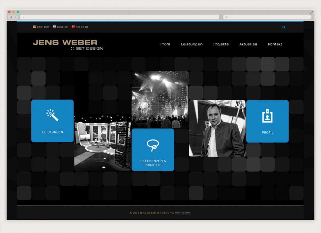 Jens Weber Set Design betreut seit 1995 Fernsehproduktionen für ARD, ZDF, BBC und andere Auftraggeber. Für diese entwirft und realisiert Jens Weber Umgebung und Erscheinungsbild beispielsweise von Sendungen wie dem Deutschen Radiopreis oder 3nach9 im NDR. Nationale und internationale Sportproduktionen nehmen hier einen großen Part ein. Innenarchitektur, Kongresse, Messeauftritte und Fernseh‐Unterhaltungsshows sind ein weiterer Schwerpunkt seiner Arbeit, seit 2008 zunehmend auch in China.